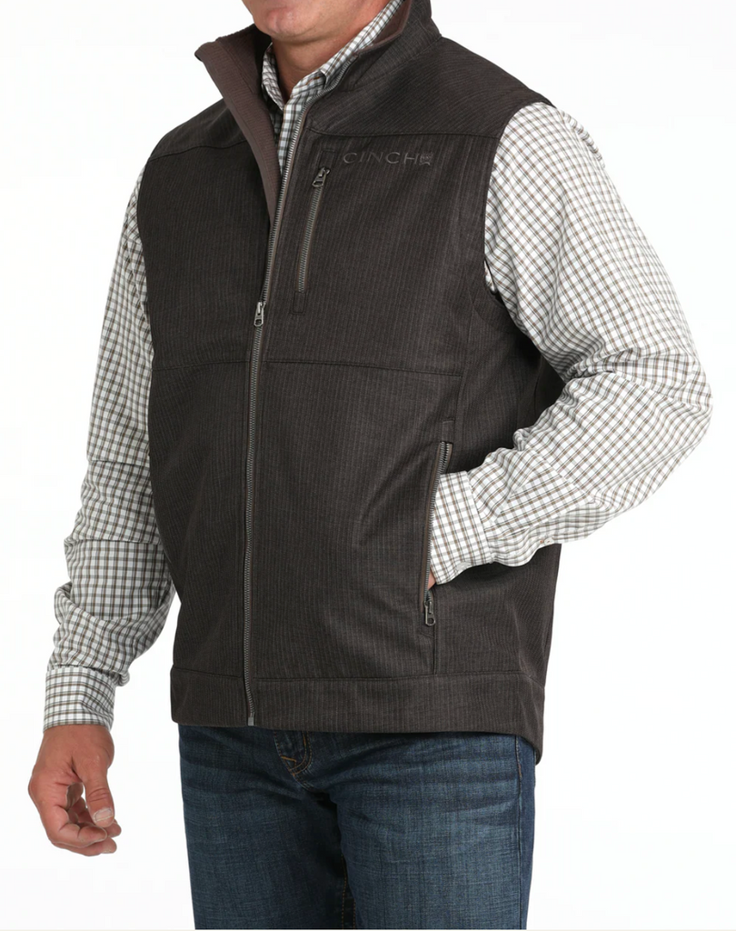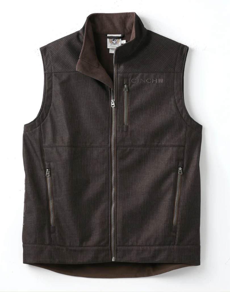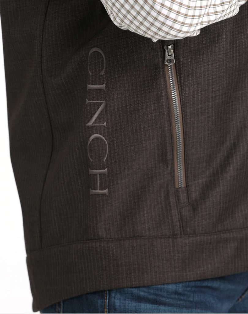 Layer like a pro with our brown polyester herringbone bonded vest that keeps your style meter high and your core warm and dry. Design features include metaluxe zippers, exterior pockets, CINCH logo embroidery, and Durable Water Resistant (DWR) finish.