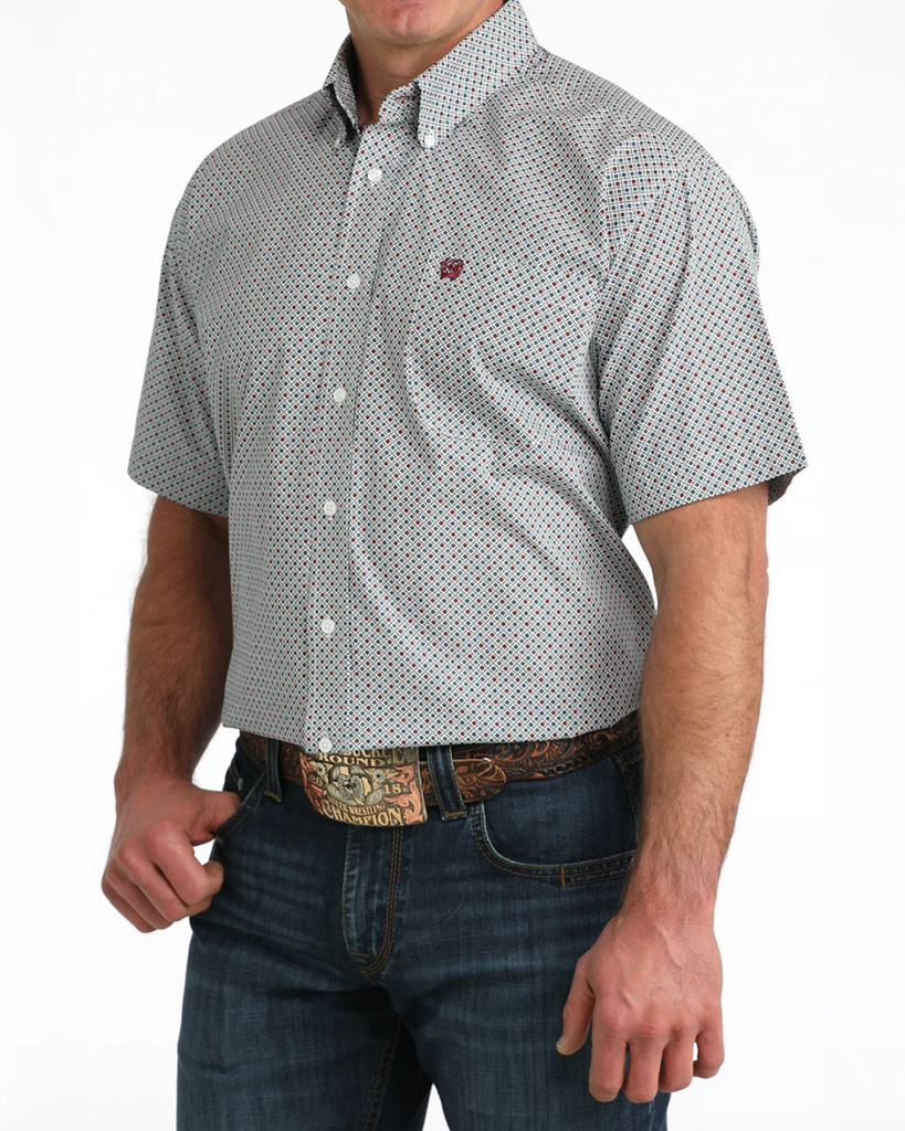Engineered by CINCH for elevated style, this white geometric printed cotton plain weave delivers a clean, modern look. Designed with an open left front pocket, signature logo embroidery, and classic white buttons, this versatile shirt effortlessly upscales blue jeans for the office, the ranch, or after hours.